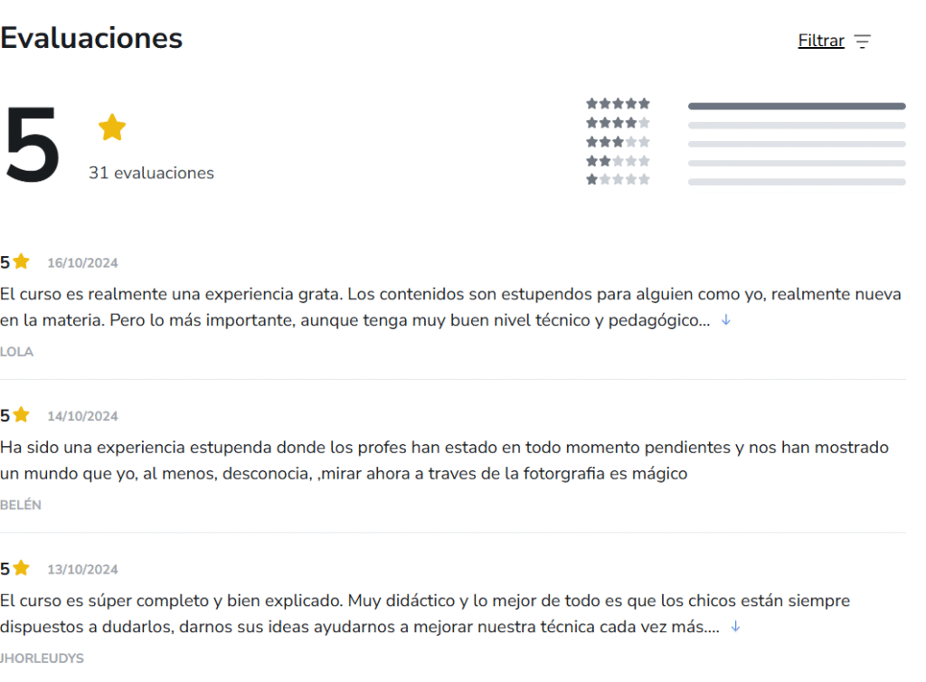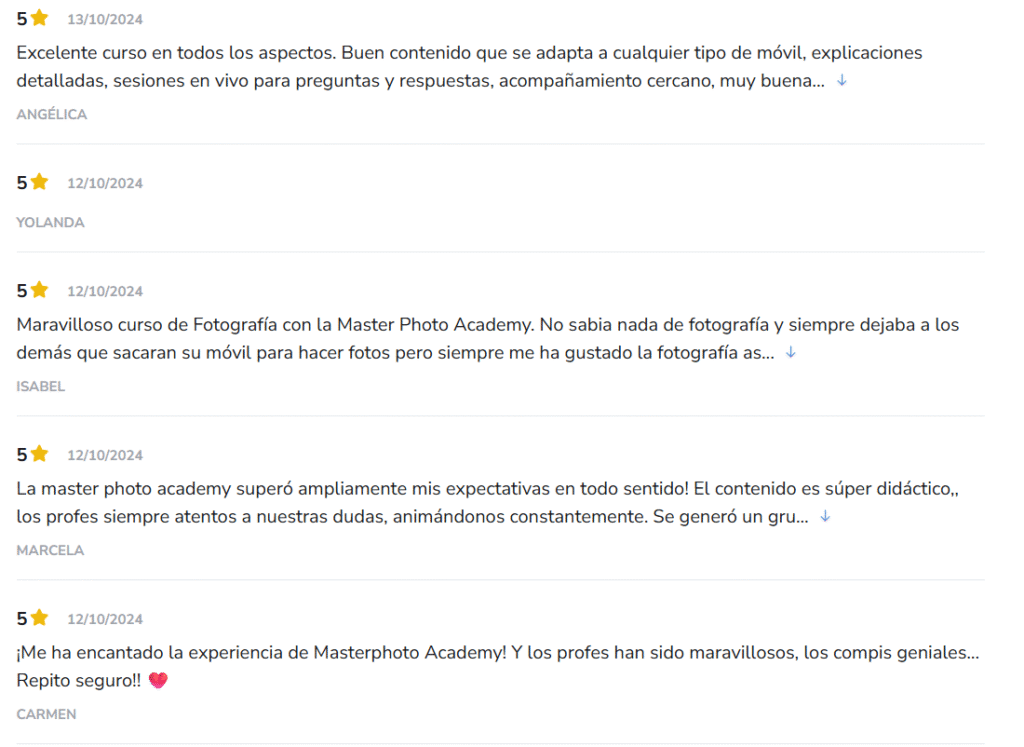 El curso MasterPhoto Academy cuenta con múltiples opiniones positivas y una calificación de 5 estrellas en Hotmart ⭐⭐⭐⭐⭐, lo que refleja la satisfacción de sus alumnos y la efectividad del curso para aprender fotografía móvil de manera profesional.”