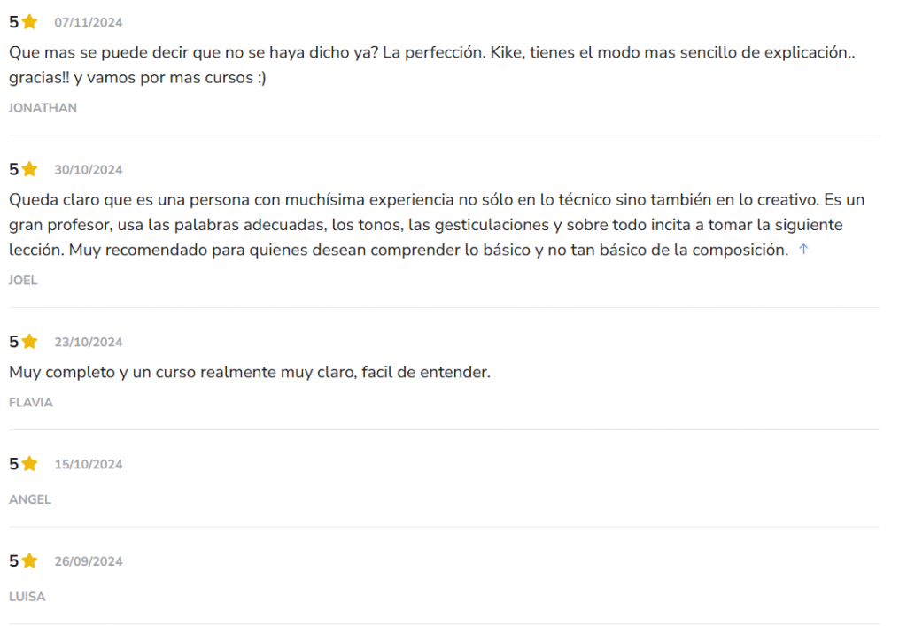 Si ya tienes experiencia con cámara en modo manual, algunas lecciones pueden resultarte básicas. Aunque los módulos de composición y edición sí aportan valor para niveles más avanzados.